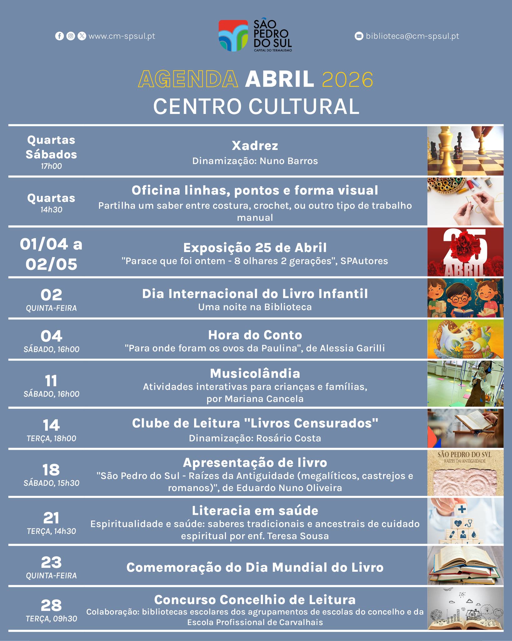 Em abril, o Centro Cultural de São Pedro do Sul continua a ser palco de cultura, partilha e inspiração, com uma programação diversificada que convida toda a comunidade a participar.