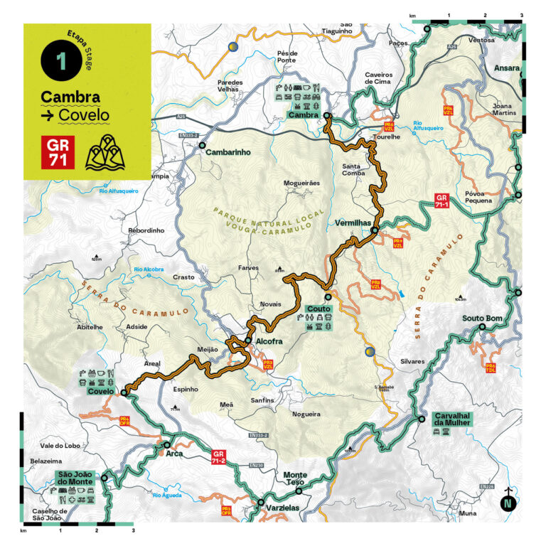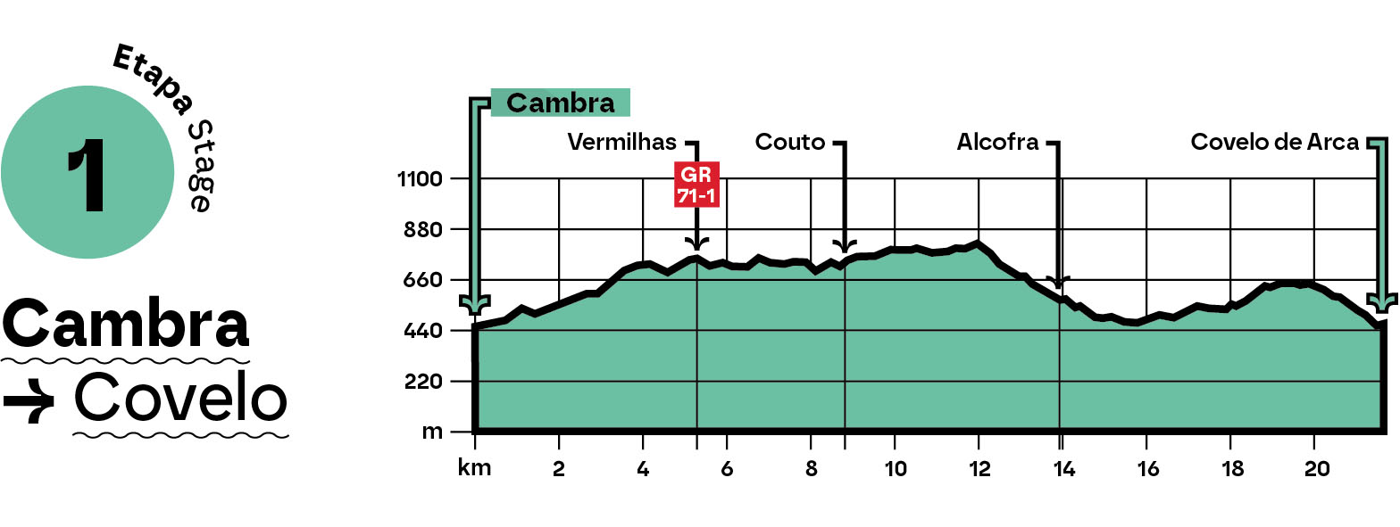 Descrição da etapa: Partindo da Torre Medieval de Cambra, seguimos pela margem do rio Couto, entre carvalhais e vegetação autóctone, até à Cova do Lobisomem, abrigo de lendas antigas que se mantêm no imaginário local. Cruzamos a antiga Fábrica do Queijo e chegamos a Tourelhe, onde a capela e o miradouro convidam à contemplação. Passando pelo Couto, subimos à crista da serra até Farves, miradouro natural que permite, em dias limpos, avistar a ria de Aveiro. Atravessamos Alcofra, com a sua praia fluvial, e subimos até Espinho. A descida leva-nos ao Covelo, final desta etapa de 21,5 km.