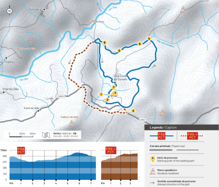 É no largo da Igreja de Na Sra da Esperança que tem início a descoberta de Vila Cova do Covelo e das suas imediações rurais e naturais. A aldeia está implantada num anfiteatro natural, pelo que após passar pelo seu centro se inicia ligeira subida até atingir a EM1429, lugar onde pode optar pela variante PR6.1 PCT, lembrando que este troço com cerca de 4 km não o leva ao ex-líbris deste percurso, as maravilhas da ribeira do Carapito.